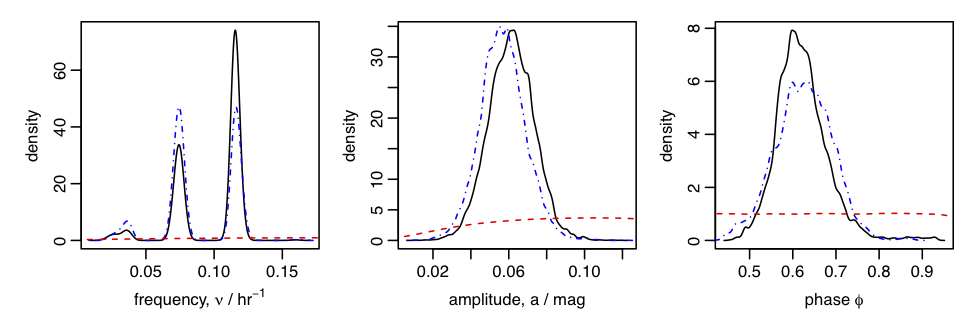 | Figure 2: Posterior probability density function (black/solid line for one data partition, blue/dot-dashed for another) and prior PDF (red dashed line) over the three parameters of the sinusoidal model for the light curve of calar3 |