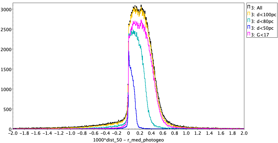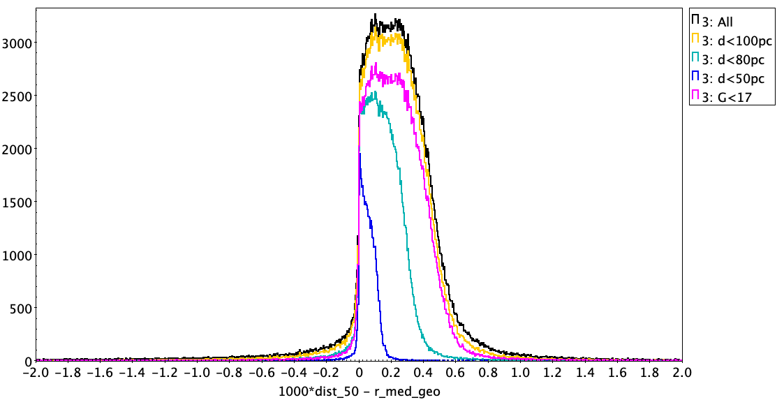 The top two plots below compare the GCNS distances with our geometric and photogeometric distances, for all common sources (323 431 sources; black line), as well as those subsets with parallax SNR greater than 100 (249 380 sources; orange) and 500 (114 394 sources; blue). The vertical axis is counts per bin. We see a clear systematic offset, in the sense that on avergae the GCNS distances are larger by 0.22 pc relative to geometric and 0.21 pc relative to photogeometric (median differences). We see a slight dependence on the parallax SNR, suggesting the difference could be due in part to the different priors. But this only has an impact at very high parallax SNR, so this is unlikely to be the dominant cause. The bottom two plots below show the histograms for just those sources within 100, 80, and 50 pc (in all distance estimates) as well as those for G<17. This shows that the systematic is not due to spuriously distant stars in the GCNS beyond 100 pc, nor is it limited to faint stars.