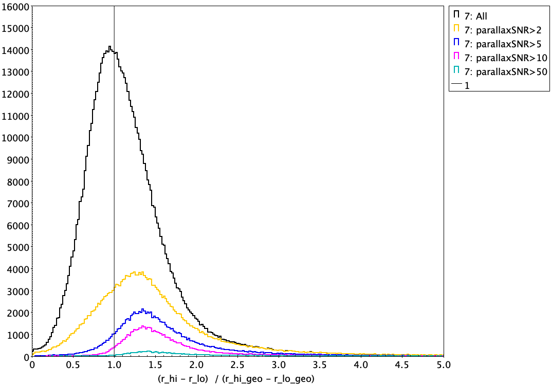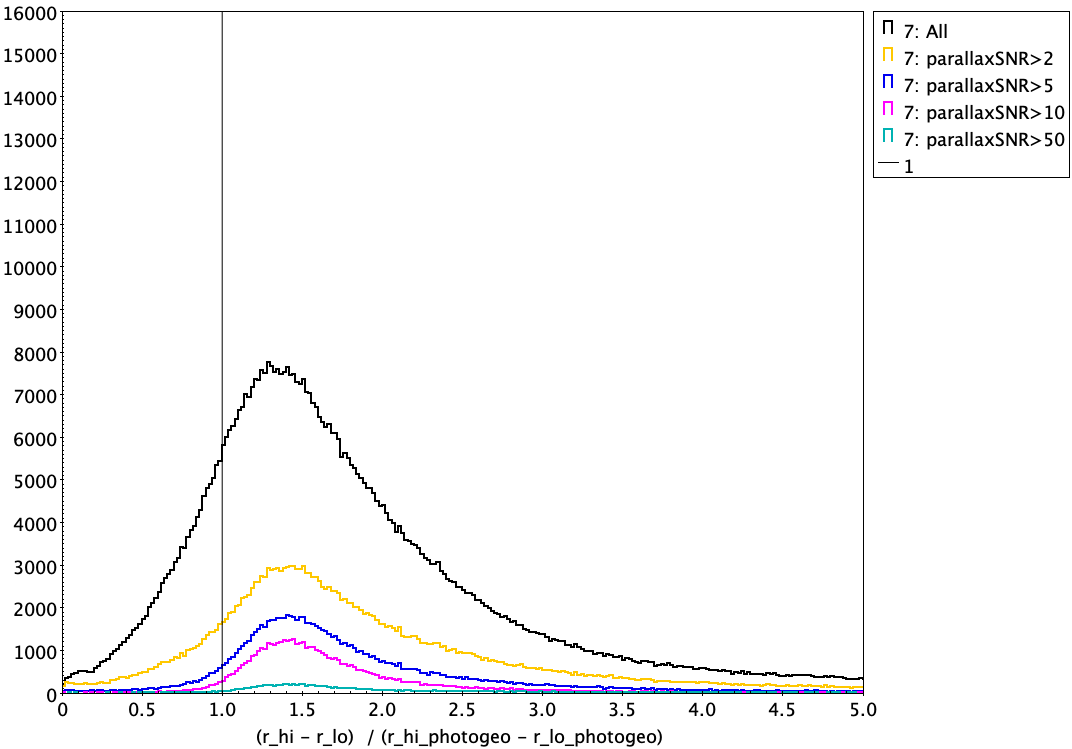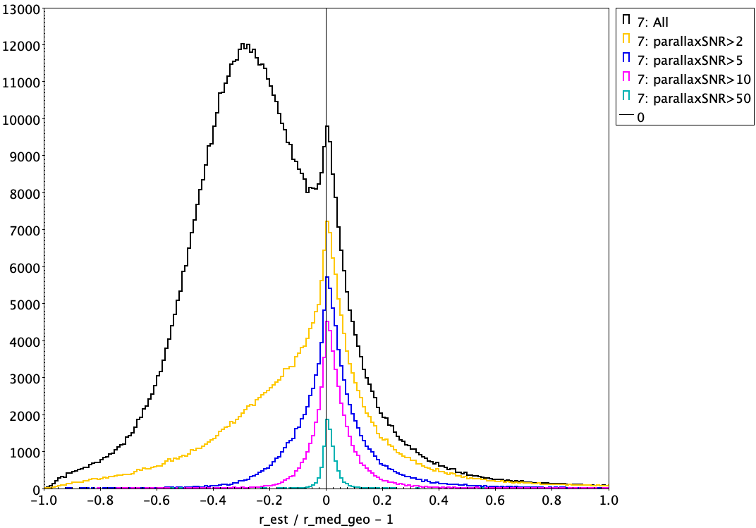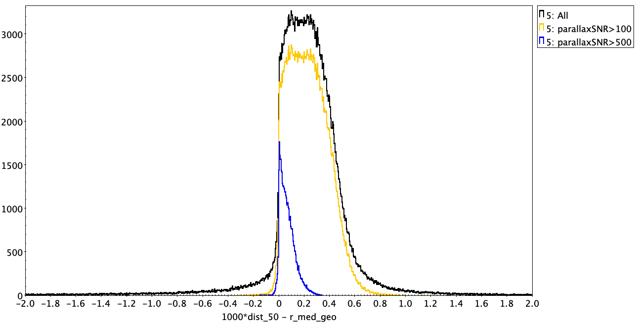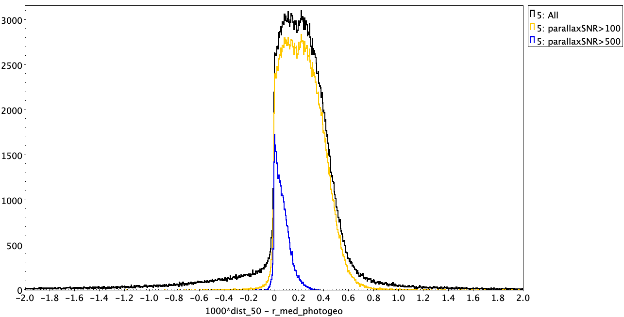 Columns of results (as in published catalogue; all distances in pc): source_id,rMedGeo,rLoGeo,rHiGeo,rMedPhotogeo,rLoPhotogeo,rHiPhotogeo,flag ### hp5=10465, source_id=5891675303053080704 (fpu = 0.016) GeDR3 catalogue: 5891675303053080704,707.516674765963,696.390096255978,717.717031977218,709.144780559287,697.88487771544,718.83098923937,10033 Original ZP: 5891675303053080704,710.490463309458,699.550572182036,721.642963524851,710.468936598579,699.550225391728,721.798957933696,10033 Modified ZP: 5891675303053080704,717.582966224147,706.431249868031,728.875073827804,717.421281502251,706.377707973145,728.845964939383,10033 dr (modified-original): geo=7.09, photogeo=6.95 Cf. the 1/w approximation from orig (dr = -r^2 dw) gives: geo=7.07, photogeo=7.07 ### hp5=9479, source_id=5336389564126521728 (fpu = 0.100) GeDR3 catalogue: 5336389564126521728,6633.12946460961,6017.6086784142,7440.78155402512,6661.19728004443,5996.31024699496,7558.429887824,10033 Original ZP: 5336389564126521728,6571.16011083943,5995.4875515791,7256.50525375428,6573.59497284227,5980.93647236675,7283.52219976453,10033 Modified ZP: 5336389564126521728,7179.65283498387,6510.46397267681,7999.94956560781,7186.29426296055,6497.1831152495,8012.09171751613,10033 dr (modified-original): geo=608.5, photogeo=612.7 Cf. the 1/w approximation from orig (dr = -r^2 dw) gives: geo=604.5, photogeo=604.9 ### hp5=3573, source_id=2011892703004353792 (fpu = 0.038) GeDR3 catalogue: 2011892703004353792,3175.53007576317,3049.06175030335,3319.56370681402,3150.63600735069,3047.60946200217,3282.08871596249,10033 Original ZP: 2011892703004353792,3173.69141875246,3052.23213118636,3304.00507726317,3168.83416124009,3048.08431747596,3298.17233328747,10033 Modified ZP: 2011892703004353792,3320.3370180146,3187.47844523341,3465.24831082359,3314.18550692321,3183.04007549041,3457.49032975933,10033 dr (modified-original): geo=146.6, photogeo=145.4. Cf. the 1/w approximation from orig (dr = -r^2 dw) gives: geo=141.0, photogeo=153.8Conclusion: If the fractional change in the parallax is not too large, say less than 10%, then the above approximation to modify the distance is okay. It can be applied to both the estimate and the confidence bounds for both geometric and photogeometric distances. Of course, there may be some sources with less smooth photogeometric priors (e.g. if they have extreme colours or sit in relatively empty parts of the CQD) such that this approximation is poor.