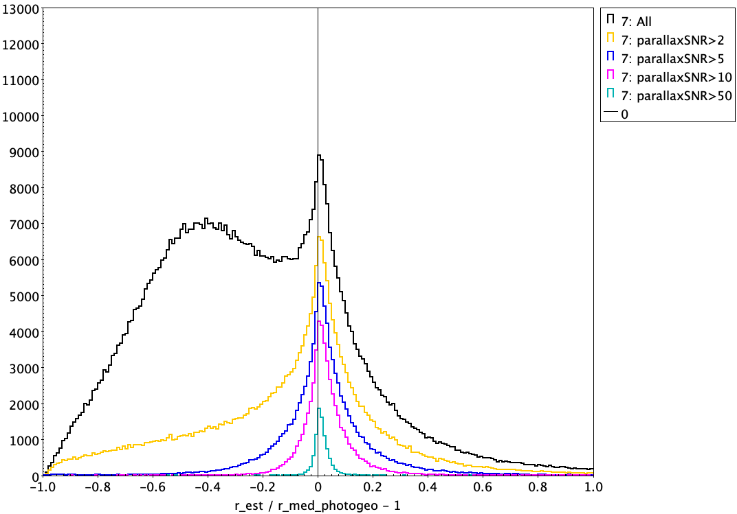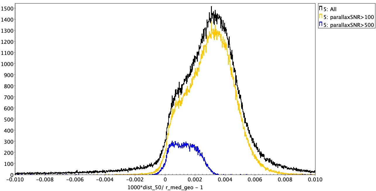 This leaves the treatment of the parallax zeropoint as a possible culprit. In the limit of the distance estimate being dominated by the data (and so the prior irrelevant), the GCNS distances will be dg = 1/w, where w is the parallax. Our distances will be db = 1/(w - wzp), where wzp is the parallax zeropint. We used the zeropoint function recommended in the GeDR3 release paper, but on average this is about -0.020 mas (note the negative sign). The ratio of these distance estimates is dg/db = 1 - wzp/w. As the median distance in the GCNS is about 80pc, or w=12.5mas, we expect dg/db = 1.0016 on average. In other words, we expect GCNS distances to be around 0.16% larger than our distances (or 0.13 pc for the average star at 80 pc) just due to the neglect of the zeropoint. This is of the order of what we actually see in the data, as is apparent from the histogram of dg/db (minus 1) shown below. For the very high parallax SNR sample the distribution is pretty much centred on 0.0016. It's not a delta function because the actual zeropoint applied depends on sky position, magnitude, and colour. For lower parallax SNR the distribution is broader and shifted to larger values, where there could also be some impact from the different choice of priors.