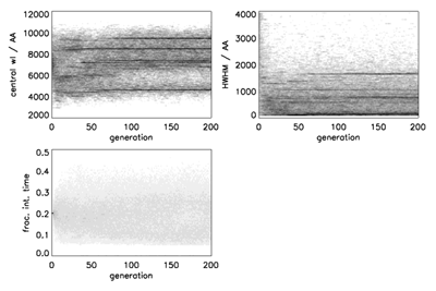 The figure above shows how the three filter parameters - central wavelength, filter width (HWHM) and fractional integration time - evolve during the successive generations of the procedure. The run shown is for the optimization of a 5-filter system (i.e. a total of 15 free parameters), using a population of 200 individuals (filter systems). Thus at each generation, there are 1000 different values of each of the three parameter types in the population. These are shown as a grey scale density plot, with darker representing more individuals. As the evolution proceeds, one can see how the central wavelength and HWHM distributions are dominated by a restricted set of values, indicating some kind of convergence.