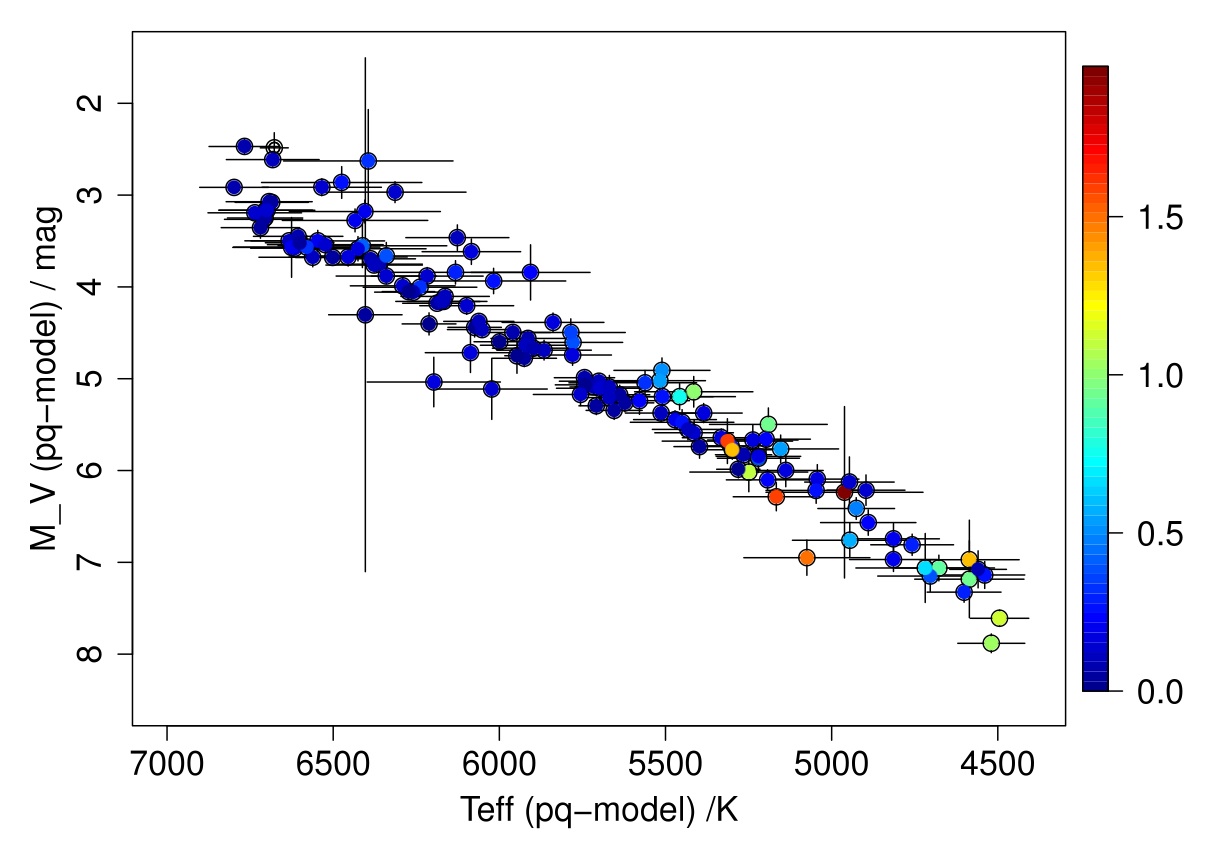 Below is the HRD of 137 stars in the Hyades cluster, with temperatures, extinctions and absolute magniutdes estimated from this model (along with 1sigma Gaussian confidence intervals on the estimates; the covariance between the uncertainties is not show) Extinction (A_V) is shown on the colour scale in units of magnitude.