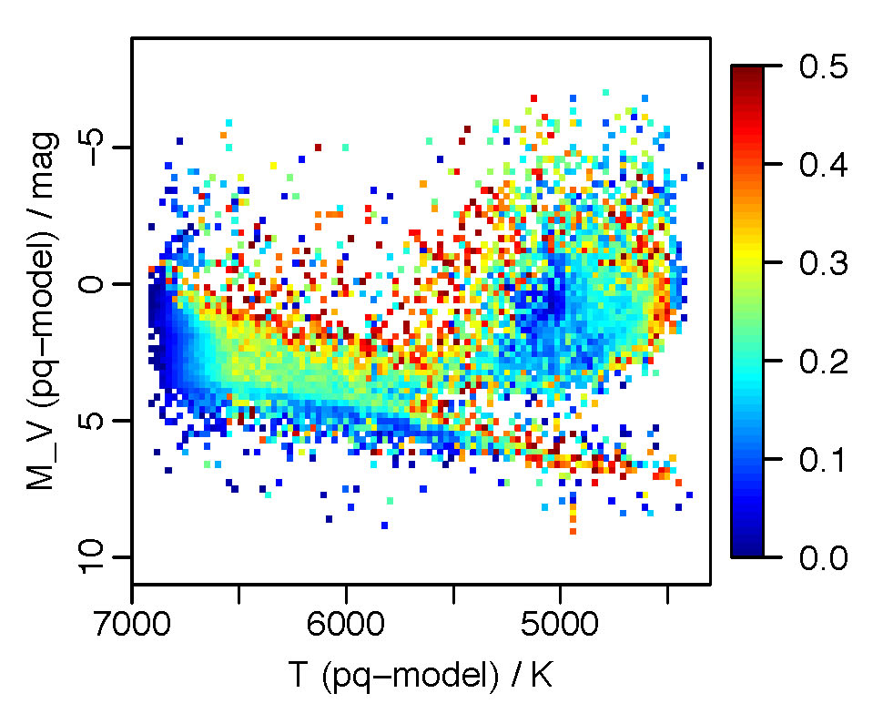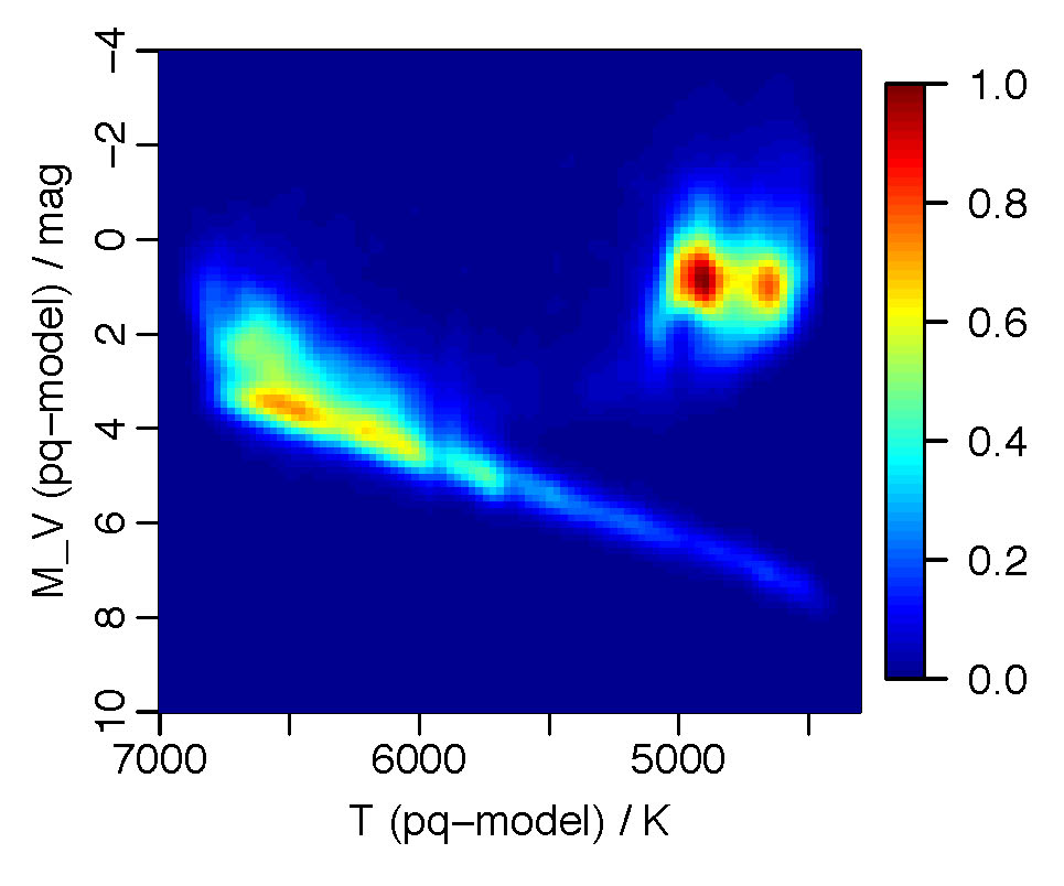 The method has been applied to a set of 85 000 stars with Hipparcos parallaxes and optical/infrared BVJHK photometry. The left picture above shows the inferred parameters of these stars plotted in the Hertzprung-Russell diagram, using a colour scale to indicate the relative density of the stars. Clearly observable is the stellar main sequence, above and to the right of which lie the giant stars. The right picture shows the same data, but now using the colour scale to illustrate the average interstellar absorption at each point.
