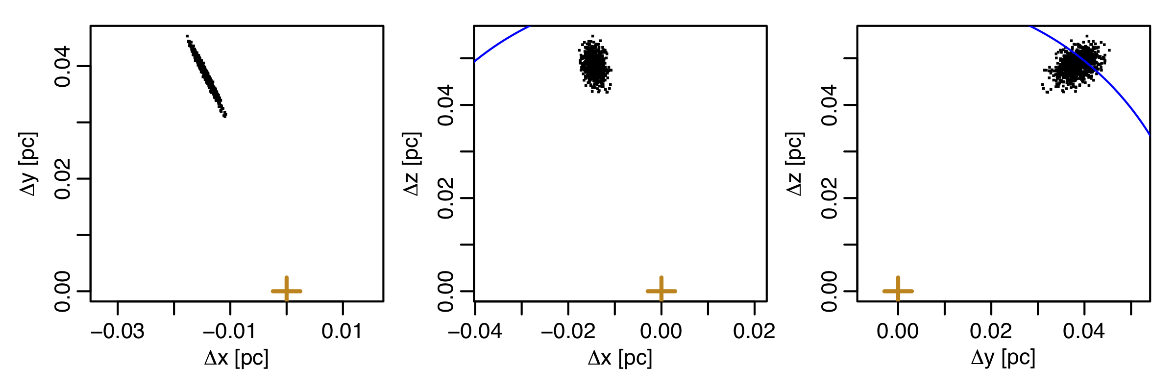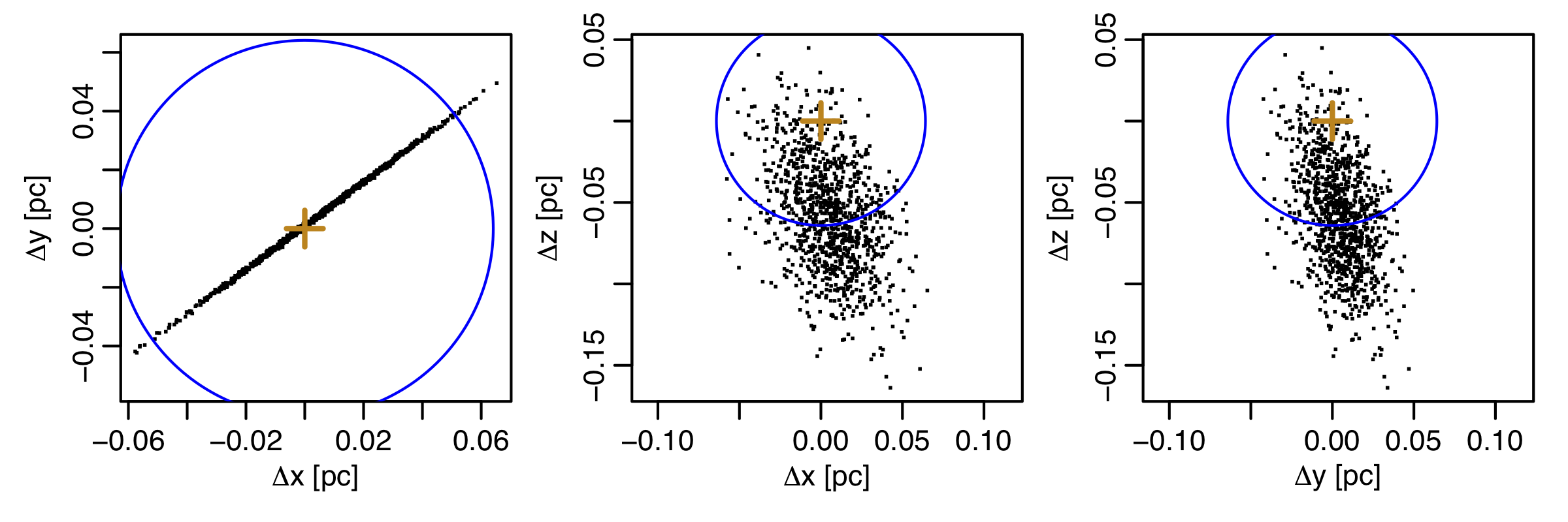 The plot above is for Gl 710 (Gaia DR3 4270814637616488064), the closest encountering star. The orange cross is the Sun (origin), each black point a surrogate. The blue arc is a cricle of radius equal to the median encounter distance, in this case 0.0636 pc. In the Galactic plane (left), we see that the surrogates form a long thin distribution poined at the Sun. In the other two projections the surrogates are more circular. Which projections are more elongated and which more circular depends on the fractional uncertainty of the velocity of the star in the x, y, z directions, which are not parallel to the proper motion and radial velocities (as those are defined in spherical polar coordinates relative to the Sun). The "side" projections show that the surrogates are all passing above the Sun.