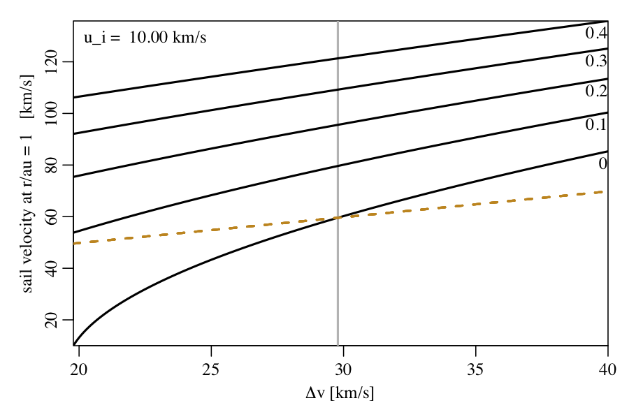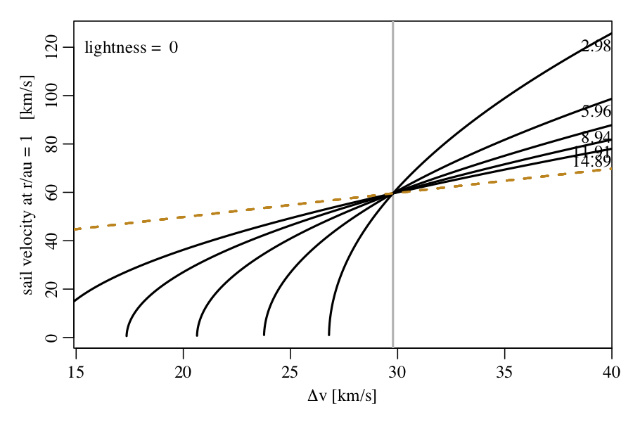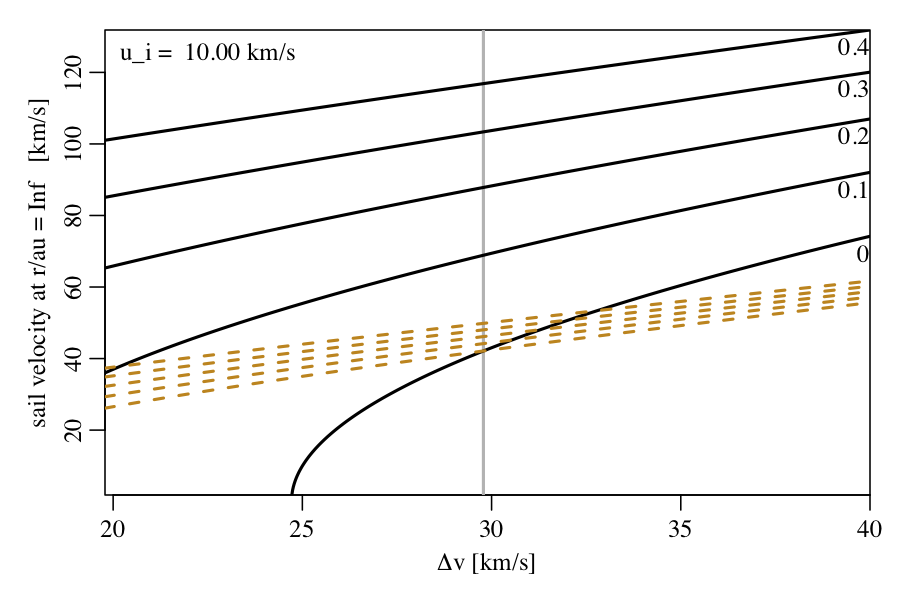 Another way of looking at this is in the plot on the top right. This plot has the same axes as the one on the top left, but is now for fixed lightness=0 and variable ui (indicated in km/s at the top right). As long as Δv < vi the dive is not worth it, but above it us. This issue of diving for the non-sail case has also been investigated by Blanco & Mungan (2021). Their Figure 2 likewise shows that the dive (they call it "Oberth") gives a larger velocity (at infinity in their plot) only once Δv > vi (Δv/vo > 1 in their notation). Their paper also investigates, again for the no-sail case, the three-impulse bi-elliptic manouevre I mention in section IV.C (they call it "Edelbaum manoeuvre"). This is more fuel-efficient than the two-impulse manoeuvre, and is superior to the no-dive case ("direct escape") already for Δv slightly below vi.